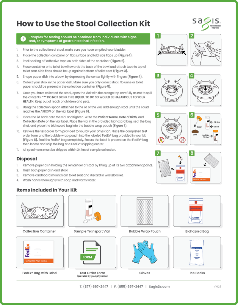 Step-by-step instructions for collecting and mailing stool samples for GI pathogen testing.